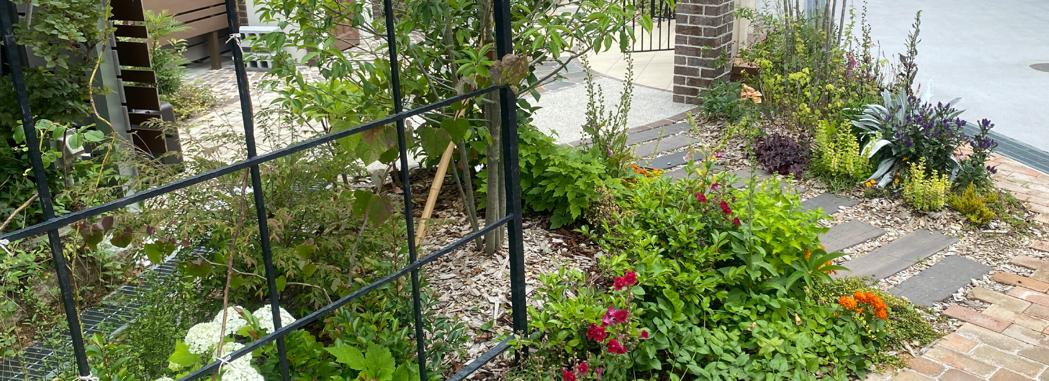 オープン外構からクローズ外構へのリフォーム事例のご紹介。華やかな花壇に囲まれたナチュラルで素敵な家周りに仕上がりました。(枚方市・K様邸)