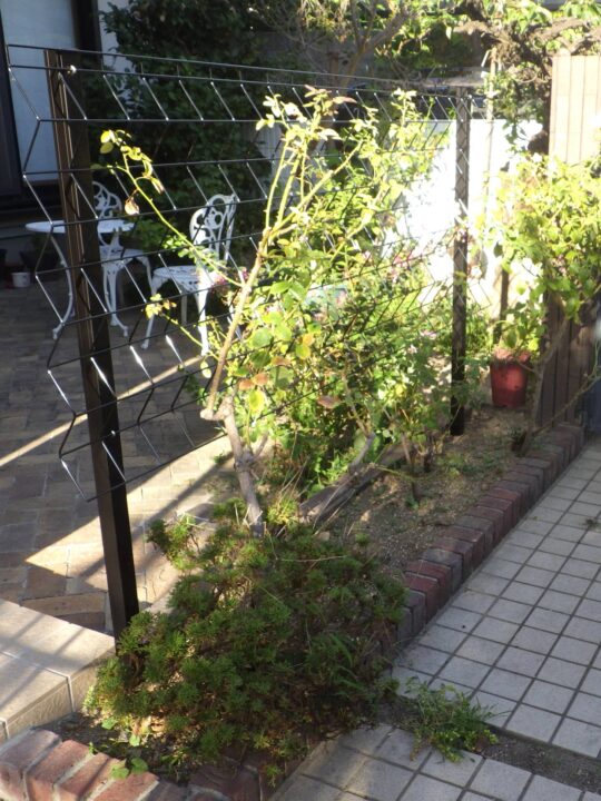 アプローチ側の花壇にトレメッシュフェンスを設置しました。風通しもよく、バラを誘引するのに最適です。