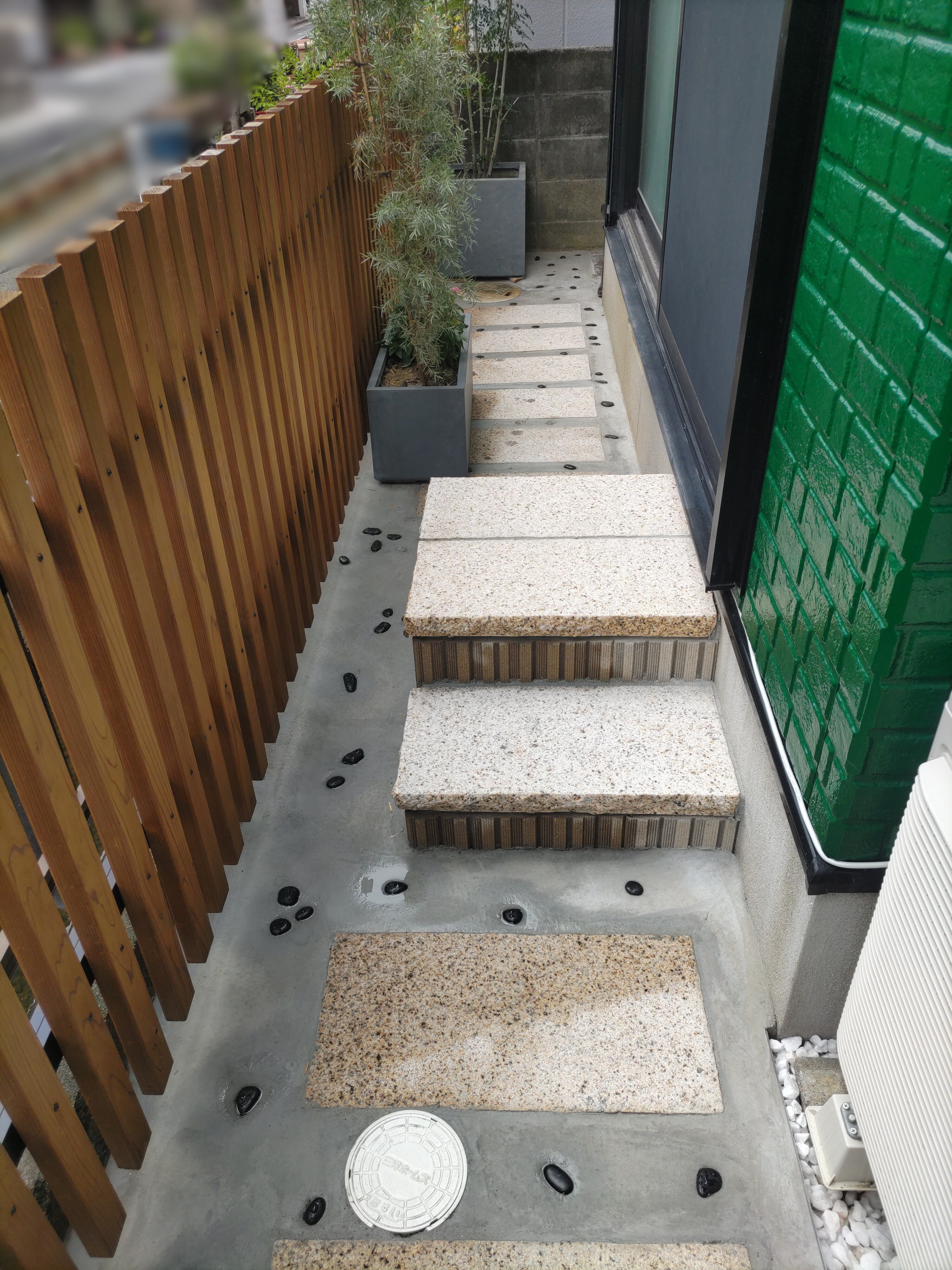 通路部分にはコンクリート土間で仕上げ、一部那智黒石を配置しました。錆御影板石を敷いて表情豊かなアプローチになりました。同じ石材のステップも設けてお部屋からの出入りも楽になりました。