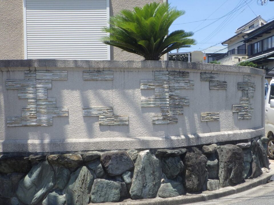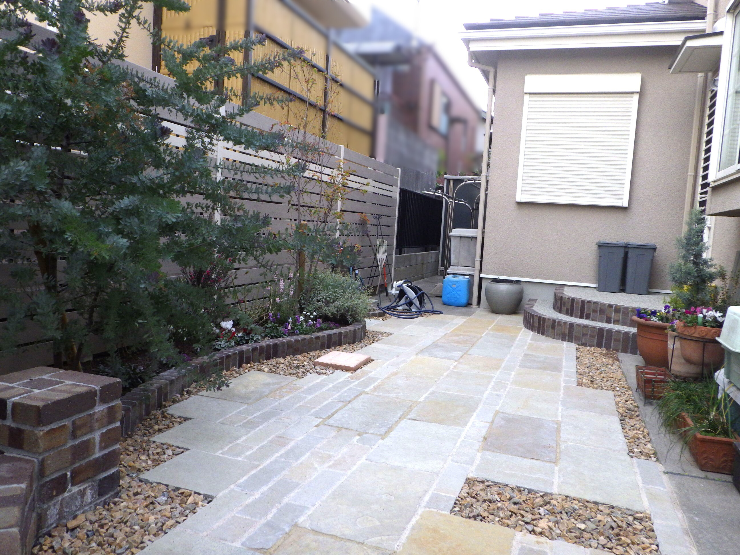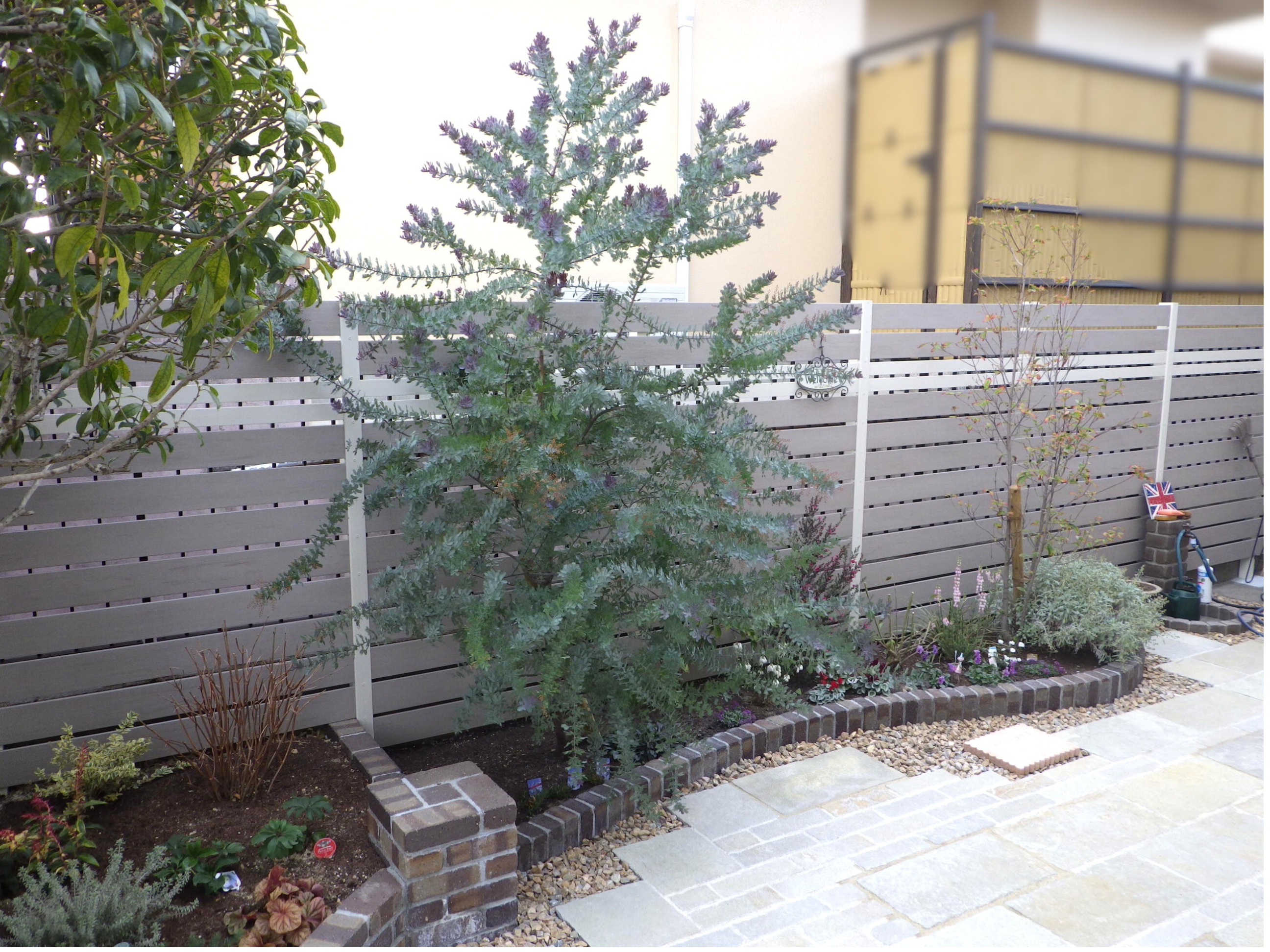 既存のキンモクセイに合わせて花壇を作成しました。曲線的なデザインのレンガ積み花壇が特徴的で、コバタテ積や、角柱も取り入れて庭にリズムとアクセントを加えています。既存のユキヤナギは裏庭に移植させていただきました。