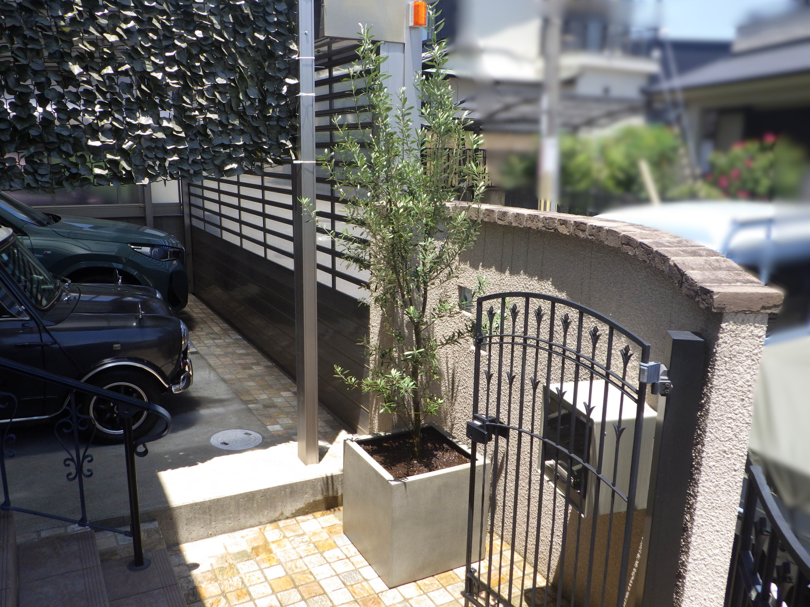 玄関にプランターを設置し、オリーブを植えました。オリーブのふわりとした葉と、直線的で硬質なキューブ型プランターが、素敵ですね♪