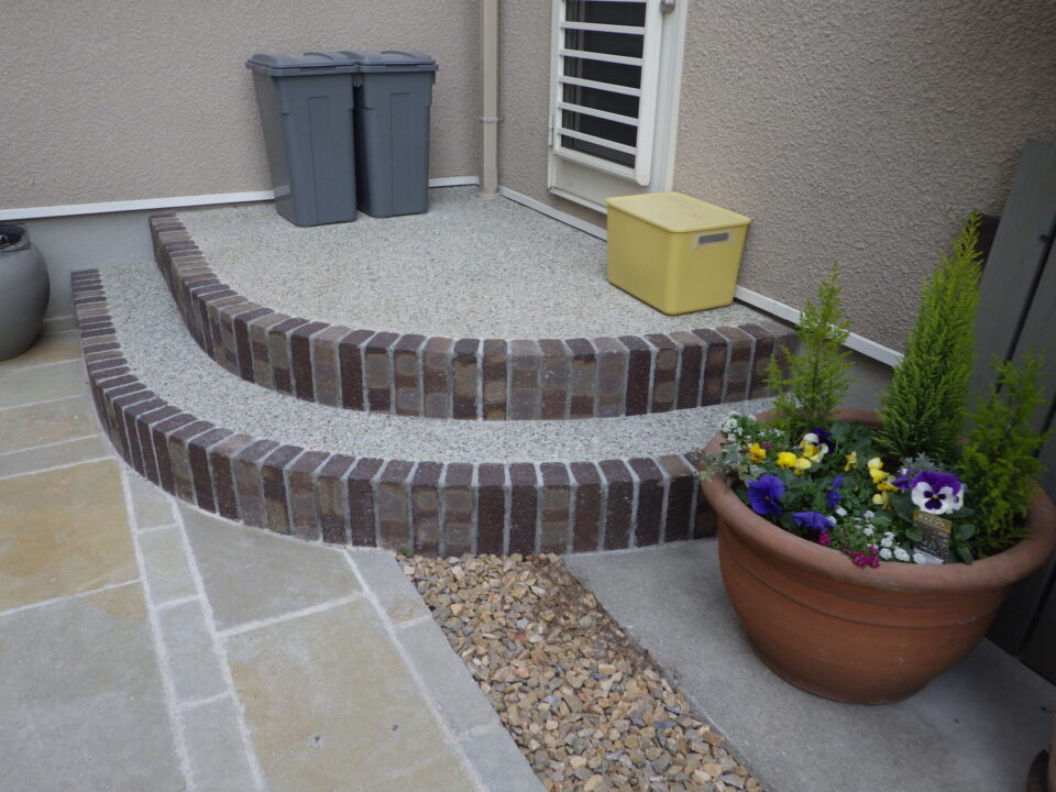 曲線的で暖かみのあるレンガと洗い出しの組み合わせのステップを施工しました、2段目が広くなり昇り降りが安全になりました。ナチュラルで優しい雰囲気に仕上がりました。