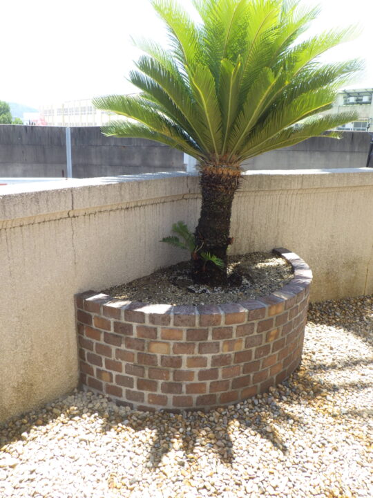 高さのある花壇を作成し、ソテツを移植しました。南国風のリゾートガーデンのシンボルツリーとして、地植えよりも視線を集めやすく、庭のフォーカルポイントになりました♪