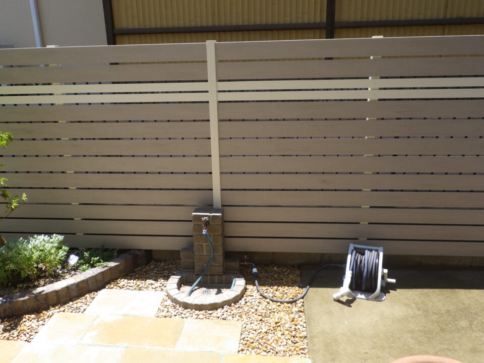 庭の背景として、横張りの樹脂製のフェンスを設置しました。横格子デザインは、空間に広がりと安定感を与え、プライベートな空間を確保する役割を果たしています。マーブルブラウンの板とアイボリーの板を組み合わせたフェンスでナチュラルなお庭を演出しています。