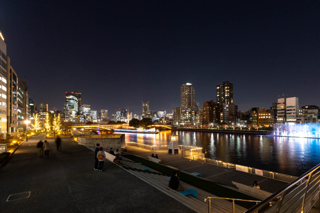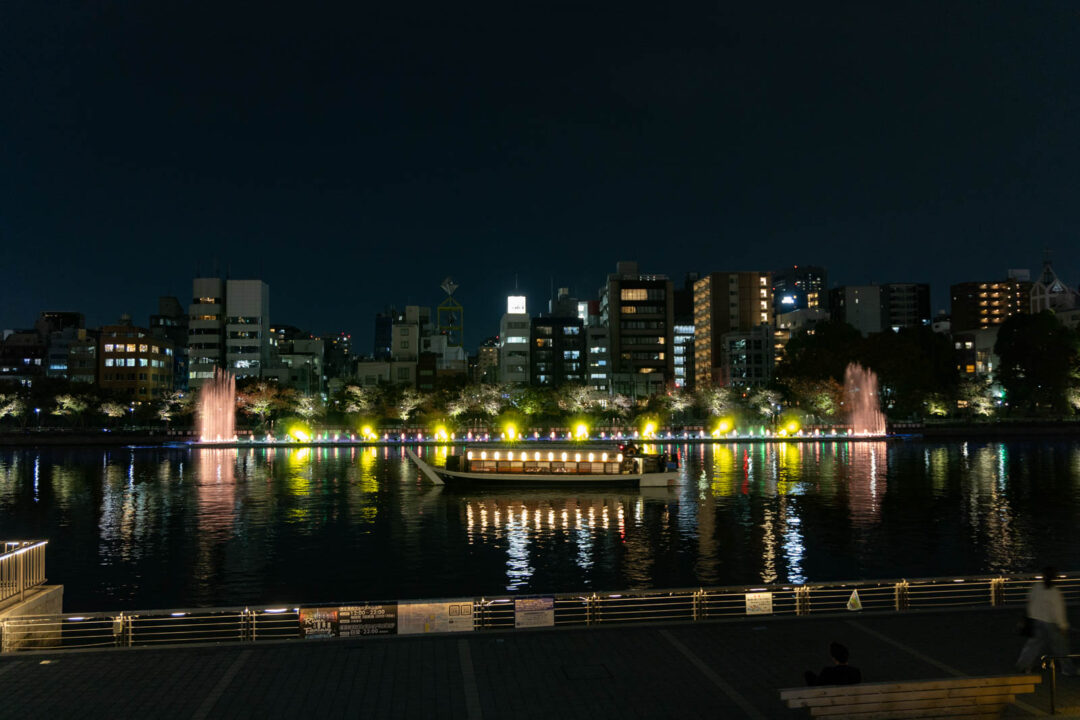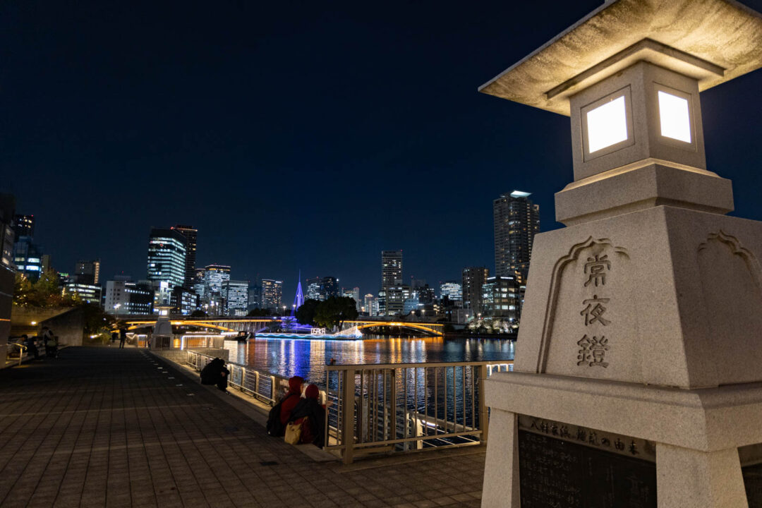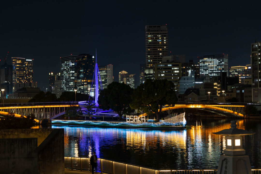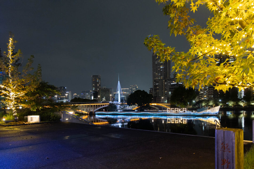 中之島公園の東端の剣先部分が「光の三十石舟」としてライトアップされるほか、天満橋八軒家浜の遊歩道の手すりや樹木もライトアップ。OSAKAリバーファンタジーの噴水ショーと合わせて、八軒家浜の夜を華やかに彩りました。